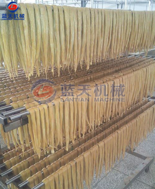 第三步——蒸煮抄條,將豆?jié){加熱時,表面出現一層膜,即可將豆?jié){膜掛至竹竿上(此步稱為抄條),竹竿掛滿后轉移至烘車上。抄條時高溫操作注意操作人員人身安全。