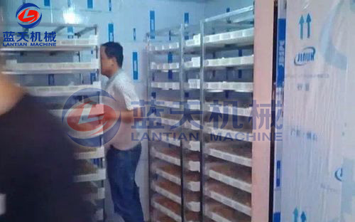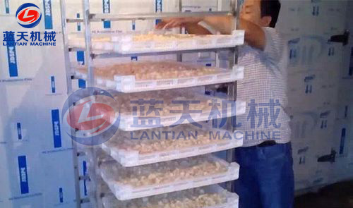 將蒜片均勻鋪放在不銹鋼物料托盤上,溫度控制在55-60°C左右,烘6-8小時。烘干過程中,注意蒜片烘干房的干燥,熱風量和排濕氣量要穩定,到后期干燥時,由于大蒜纖維細密且蒜片中液體黏稠,使蒜片水分遷移蒸發變得緩慢,直至蒜片干燥至含水率約為4-6%以內即完成干燥。烘干期間須嚴格控制好時間和溫度,以免干燥時間過長,溫度過高,使蒜片干色澤、外形及營養價值受損,影響蒜片的品質。