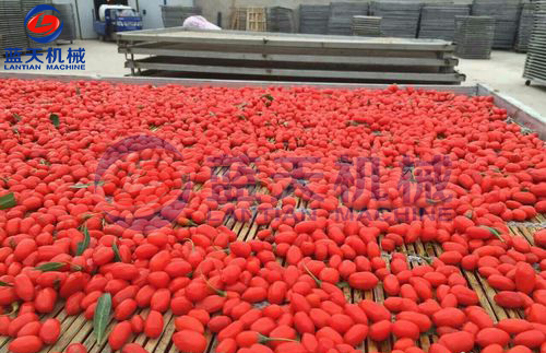 枸杞鮮果干燥的普遍現(xiàn)象是果實(shí)表面水分?jǐn)U散大于內(nèi)部擴(kuò)散速率,果內(nèi)含游離水外滲速率大于結(jié)構(gòu)水外滲速率,這是枸杞鮮果內(nèi)含糖分高導(dǎo)致脫水干燥困難的緣故。如果干燥室內(nèi)溫度過高,鮮果表面水分散失過快,而果內(nèi)水分的外滲又供不上來,則表皮會(huì)起泡,阻塞了排水氣孔,反而使果內(nèi)水分排不出來,此時(shí)皮層已脫色、品質(zhì)下降。所,鮮果先進(jìn)行表面油脂冷浸處理,加上適宜的溫度和風(fēng)速,在表皮脫水的同時(shí)通過氣孔透入果內(nèi)的溫度升高,有利于果內(nèi)的水分排出,從而加快了干燥速度,并能保證烘干質(zhì)量。