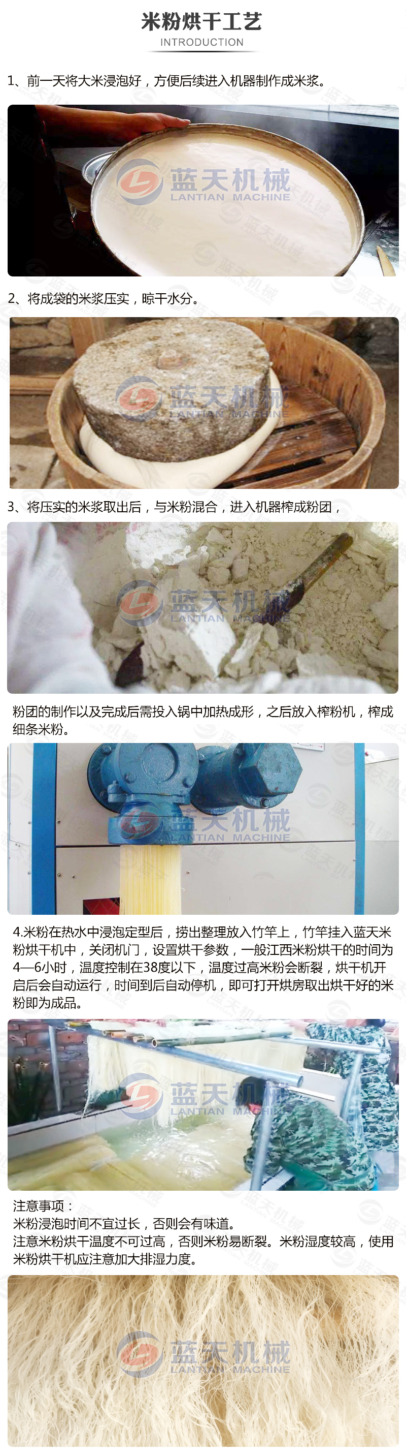 1、低溫,增大排濕:溫度35℃,烘干時間大約2-3小時。前期米粉烘干設備的烘干溫度不宜太高,否則米粉容易斷裂。米粉濕度較高,應注意增大排濕力度。