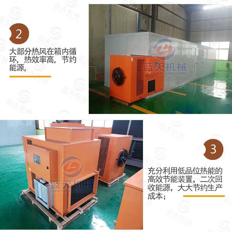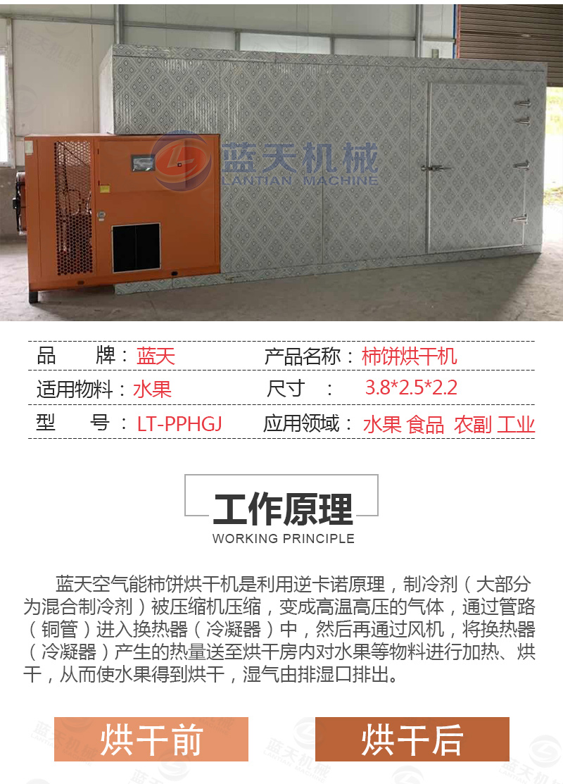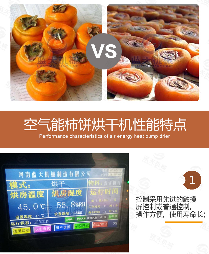 傳統(tǒng)的柿餅的生產(chǎn)周期傳統(tǒng)的自然晾曬所需要的一月有余,而采用熱泵柿餅烘干機(jī)則縮短到4-5天(根據(jù)使用時(shí)的溫濕度確定),并且在質(zhì)量上優(yōu)于自然涼曬的柿餅。在脫澀期溫度不能超過(guò)45度,濕度保持32%上下;前期烘烤期排濕不能太大,以免結(jié)皮太早以及影響回軟過(guò)程;第一次捏餅,第二次捏餅,手要輕,力要?jiǎng)颍〈罅棵撍跍囟炔荒艹^(guò)65度,濕度不能高于45度。統(tǒng)而言之為“兩烘兩停三捏”的全自動(dòng)控制烘干方法。